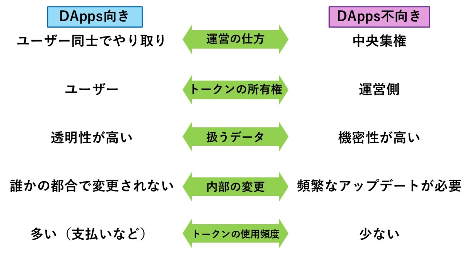 そんな幅広い利用がされているDAppsですが、アプリの内容次第で向き不向きがあるそうです。それを簡潔にまとめたものが以下の資料です。